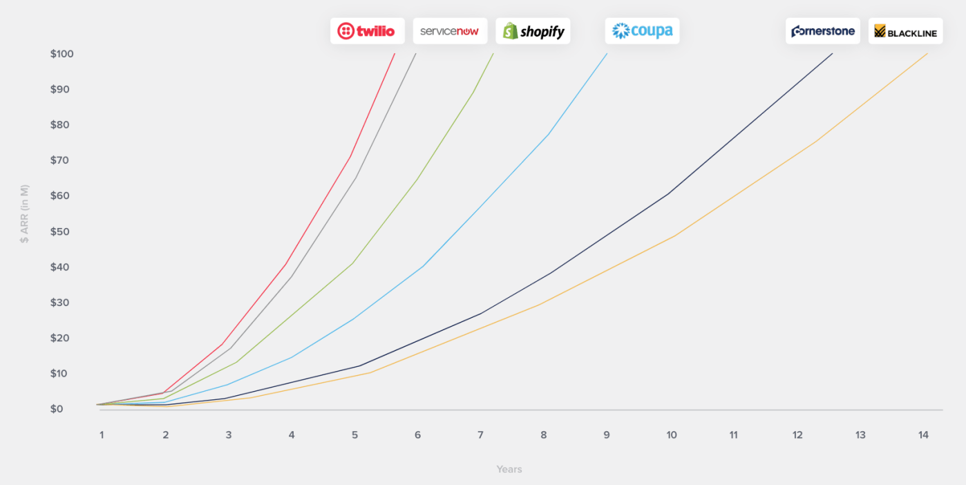 Take a step back and think about how mind blowing that is. America is a country where initiative and ideas can turn into massive value in just a short period of time. Obviously its not easy and requires boat loads of other peoples (VC usually) money but its still remarkable. The graph here (credit to Russ Thau for the visual) shows a handful of companies that went from 0 to $100MM in ARR. $100MM being significant because that when SaaS companies are generally “IPO Viable”. Look at that! From an idea to $100MM in annual recurring revenue in a short burst of time. Wow, right?!